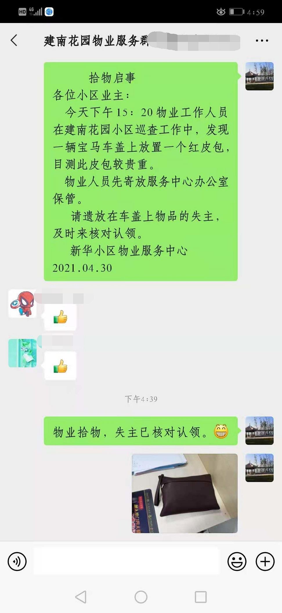 他们通过查看监控,主动发到业主群、小区物业工作群发动大家一起寻找失主。闻讯后,其他员工对魏志雄丶吴少英的行动表示赞扬,都自发地加入到寻找失主的队伍中来。