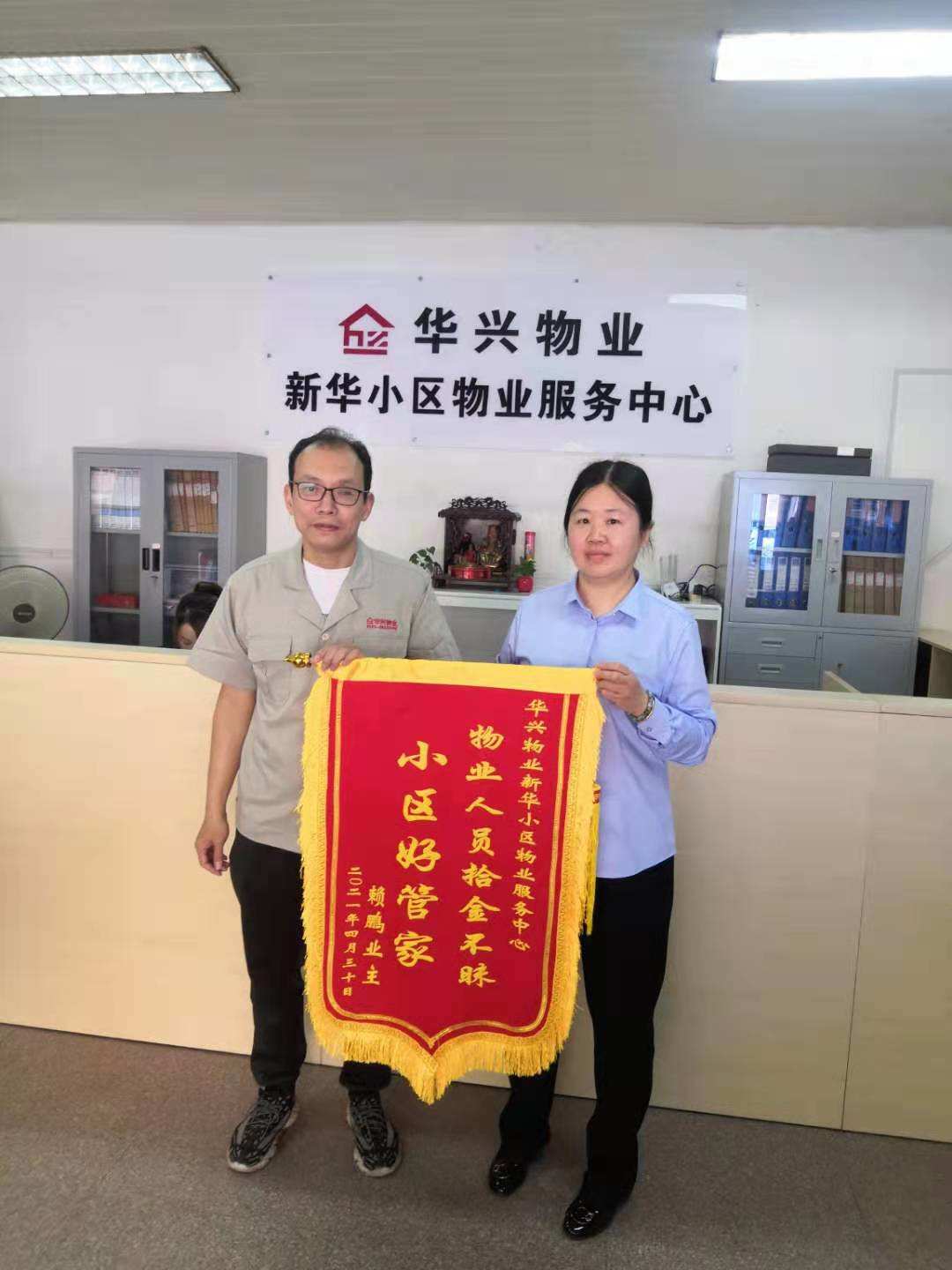 经过一个多小时的寻找,终于找到了这位业主,并将钱包完整归还。业主对华兴物业服务人员拾金不昧的精神给予高度肯定,并送上了感谢锦旗。